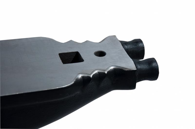 Stor halvsfärisk form på hornet. Bred slagyta och mycket plats under kanterna. Baktill på städet finns tre anhåll för att breddning av tån.