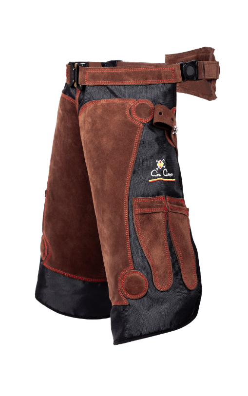Nytt fräscht förkläde från Con Cuero! Snabbkopplat spänne framtill. Varje sida av midjan har ett roterande spänne för att säkerställa att förklädet sitter perfekt när man böjer sig och står upp. De två magneterna nertill har större diameter för att hindra sömmen från att falla av. En liten kraftig magnet upptill på höger sida för att fästa skor eller verktyg på. Fyra fickor. Öppen gren. Som alla Con Cueros förkläden är de tillverkade i eldfast Kevlar och högkvalitativt skinn.