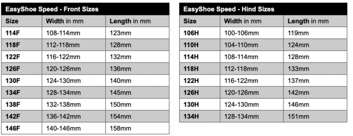 EasyShoe Speed är en limbar uretan-hästsko som är utformad med integrerade manschetter(vingar) för enkel limning. Den har smalare sko-armar för ökad grepp och friktion, vilket gör den idealisk för prestandadiscipliner. Mittendelen vid det runda hålet (s.k. Keyhole) kan klippas bort för ökad flexibilitet i dessa modeller. Det som händer då är att traktpartiet på skon kommer bli ännu mer rörligt både horisontellt och vertikalt. I Speed Metal varianten kommer detta även möjliggöra viss omformning av skon.